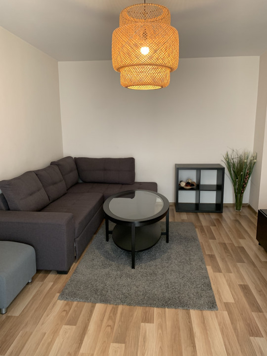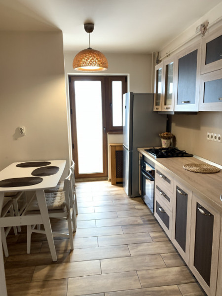 ap 2 cam cf 1 A dec, et 1/10, vedere fata, pe mijloc, S utila: 54 mp plus balcon pe toata suprafata bucatariei si livigului inchis , imbunatatiri de calitate: gresie si faianta in baie si bucatarie, gresie hol si balcon, parchet laminat in living si dormitor, temopan exterior, usi interior schimbate, usa metalica, modern mobilat si utilat complet: TV, aer conditionat, plita si cuptor incorporabile, hota, frigider, laptop, masina de spalat, bloc beton 1980, oferit cu 380 Eu/luna plus 500 euro garantie, vazut Diana